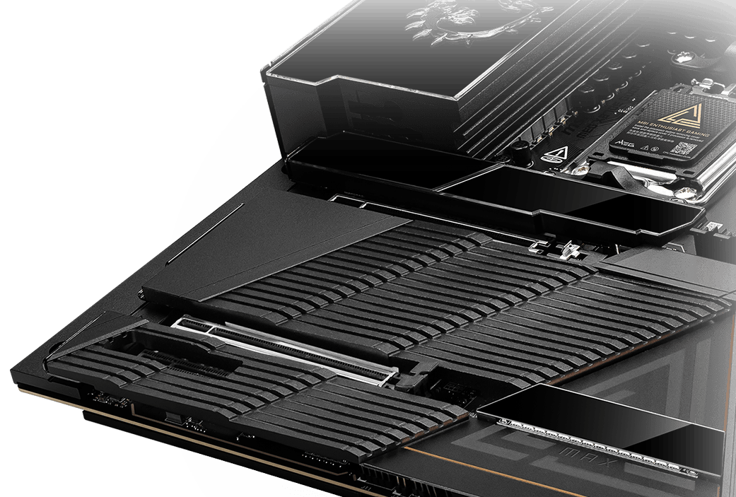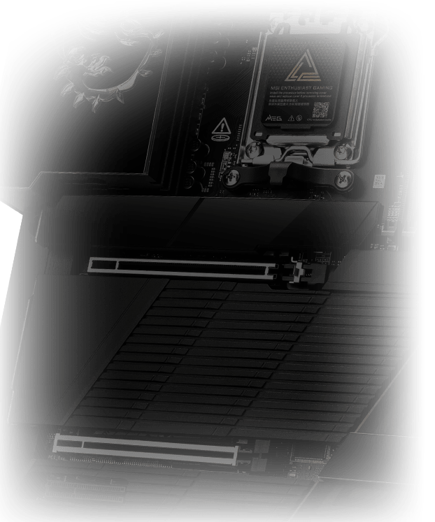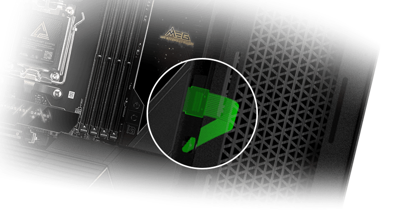 MEG X870E GODLIKE MAXは、5基のオンボードM.2スロットに加え、最新の「M.2 XPANDER-Z SLIDER GEN5」拡張カードを同梱。さらなる高速ストレージの拡張オプションを提供します。詳細はこちら