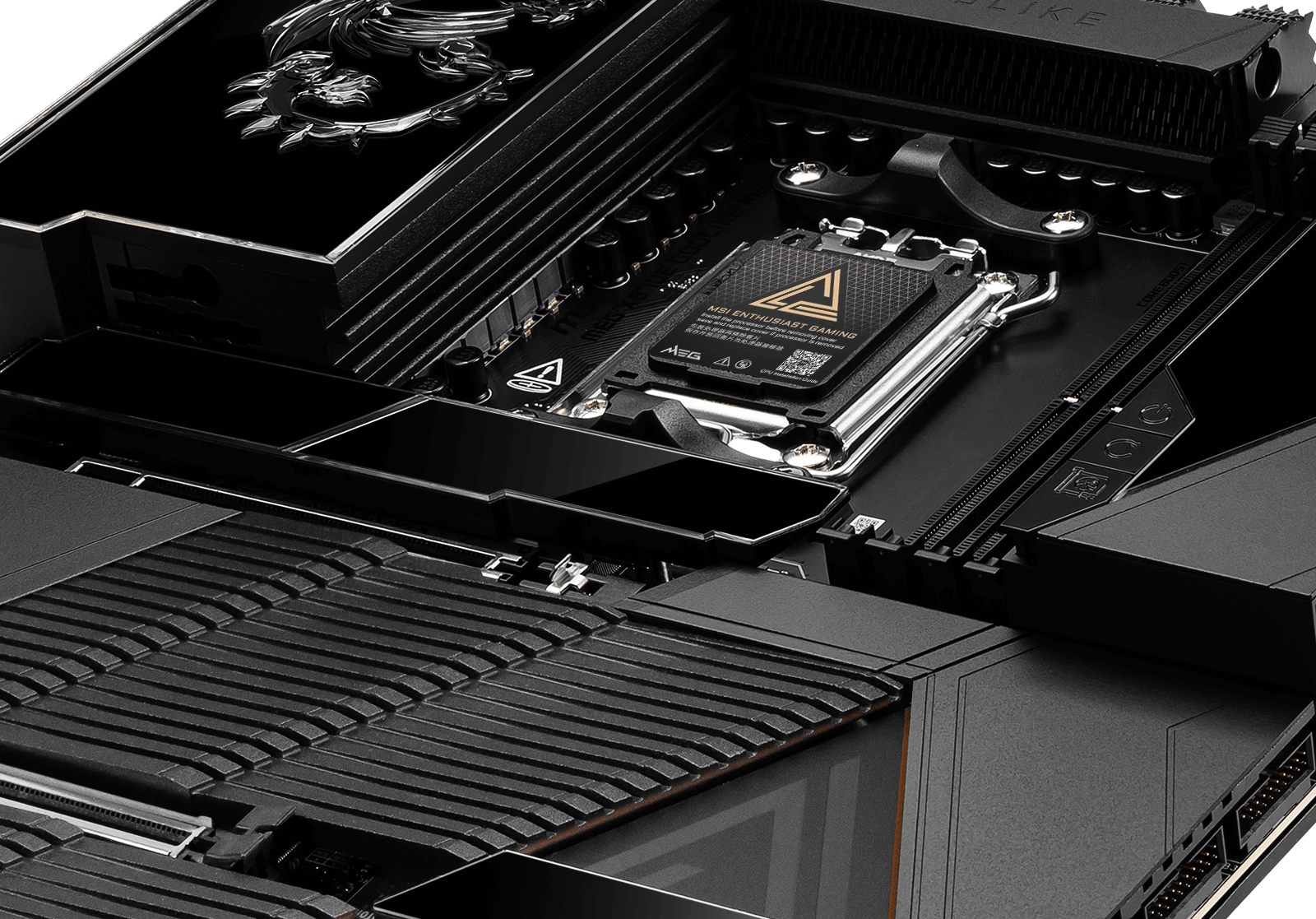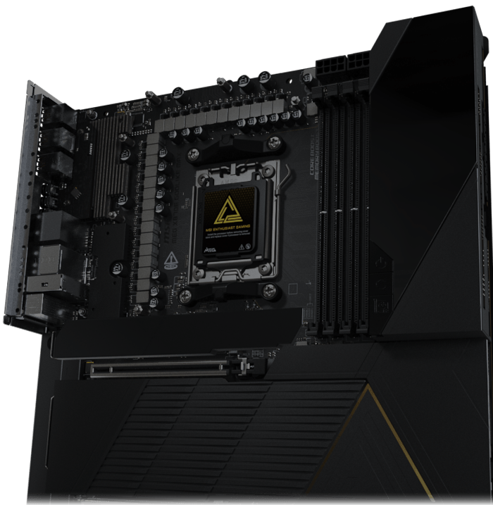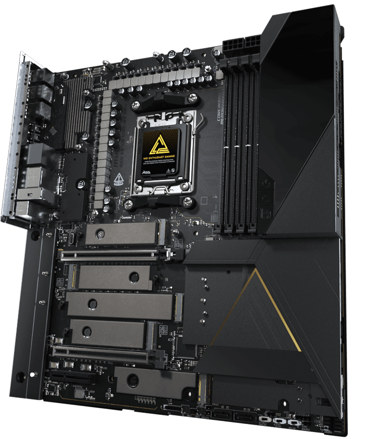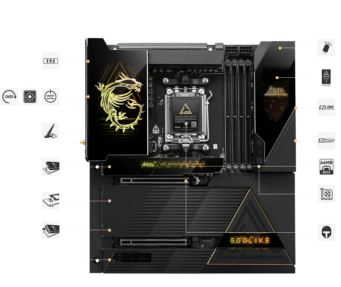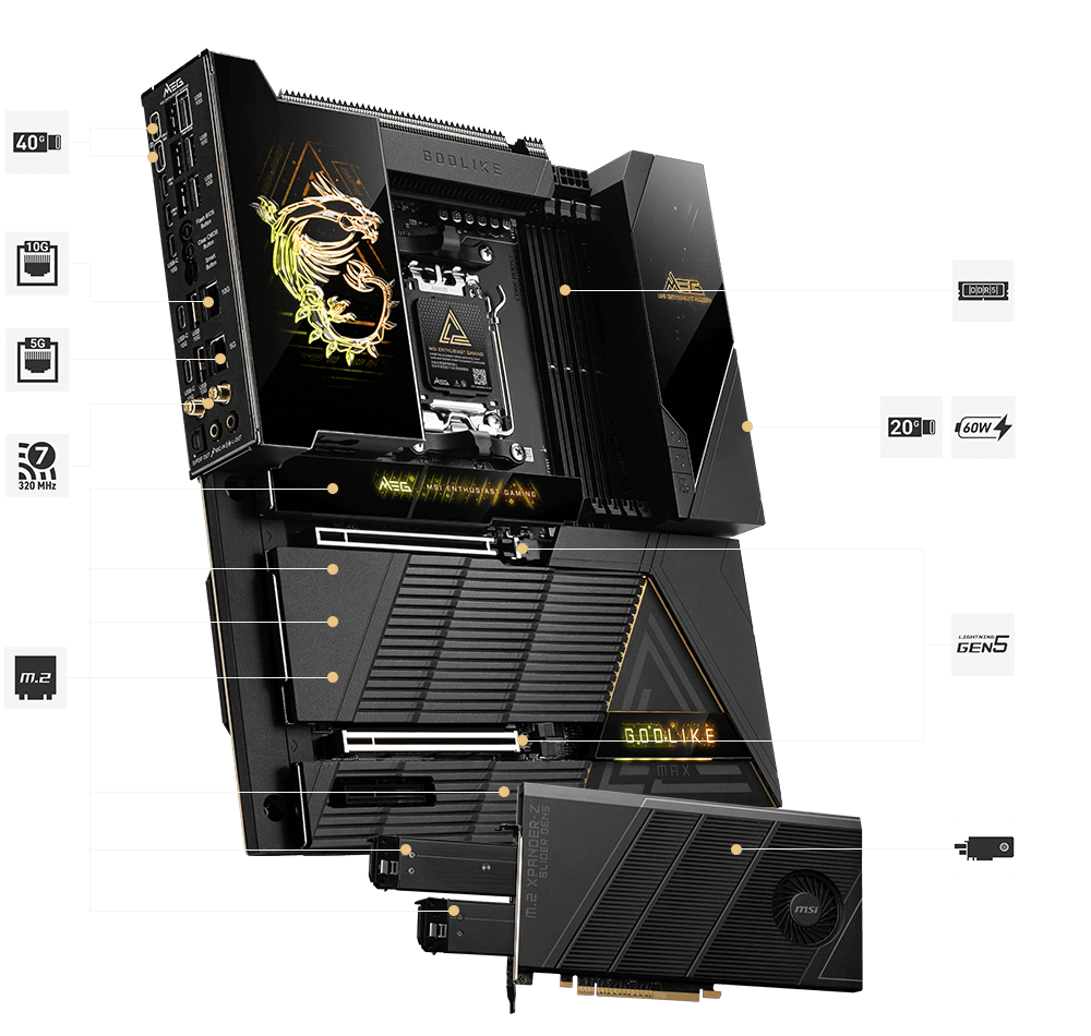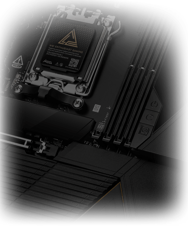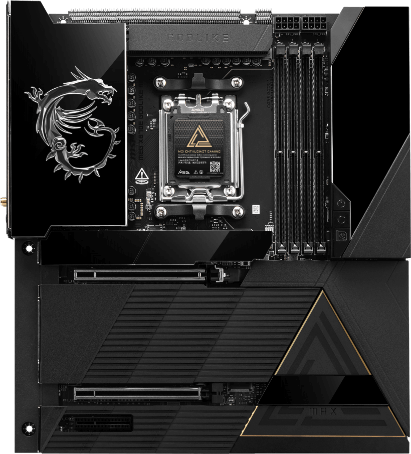 MEG X870E GODLIKE MAXがもたらす、イノベーションの極致を体感してください。 究極のAI処理能力と、限界を超えるゲーミングパフォーマンスのために設計されたこのE-ATXマザーボードは、クリスタルカットの強化ガラスをあしらった漆黒のヒートシンク、立体的なドラゴンロゴ、そして革新的な「Dynamic Dashboard III」を搭載。その佇まいは、無限のパフォーマンスと、一切の妥協を許さない完璧な造形を象徴しています。