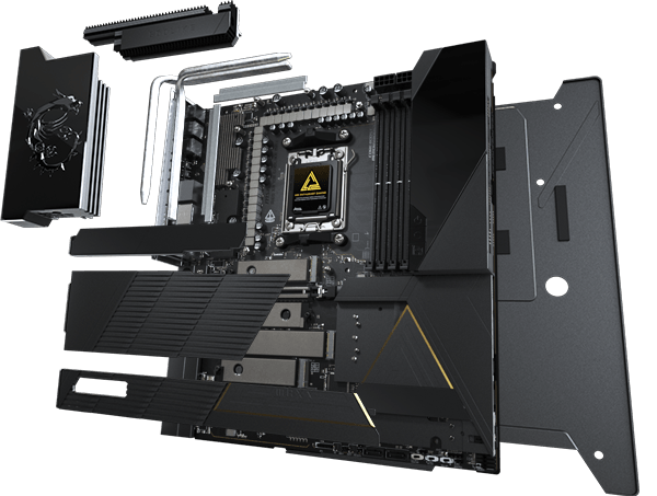 - Frozr Guard: ウェーブフィン設計、ダイレクトタッチ・クロスヒートパイプ、MOSFETベースプレート、9W/mKサーマルパッド、両面M.2 Shield Frozrを採用。Frozr AIソフトウェアとの連携により、低温を保ちながら最高のパフォーマンスを引き出します。