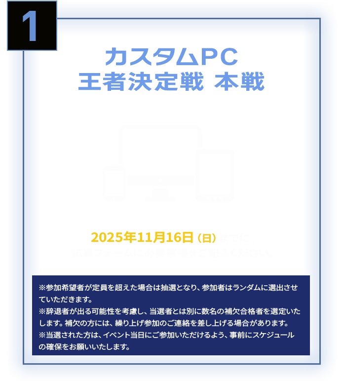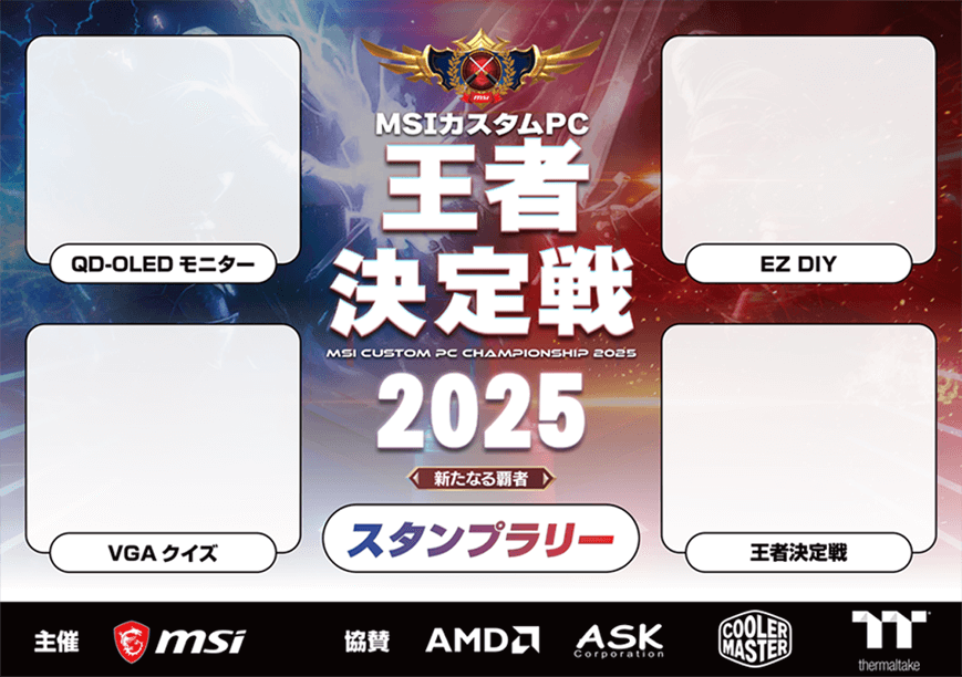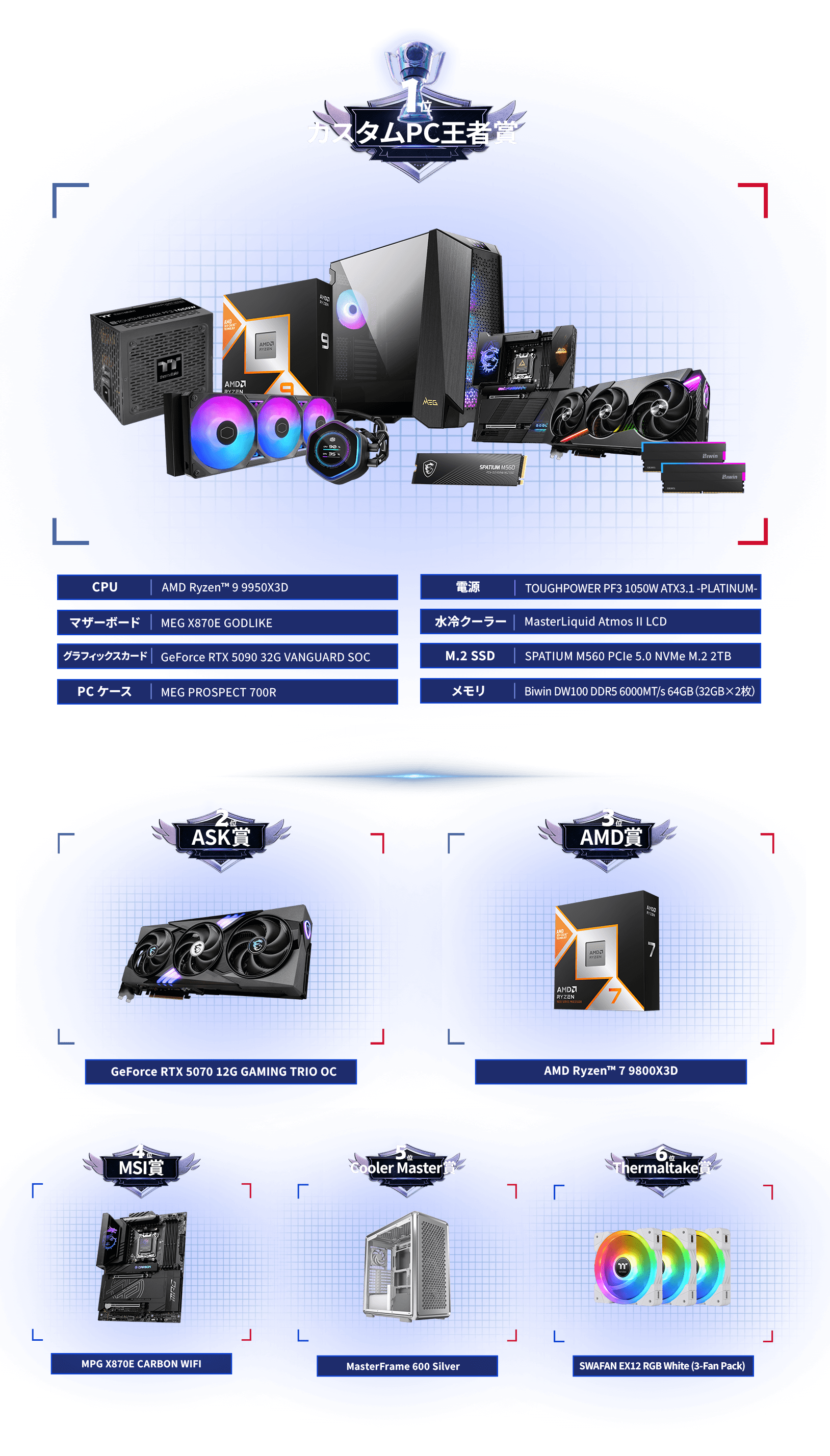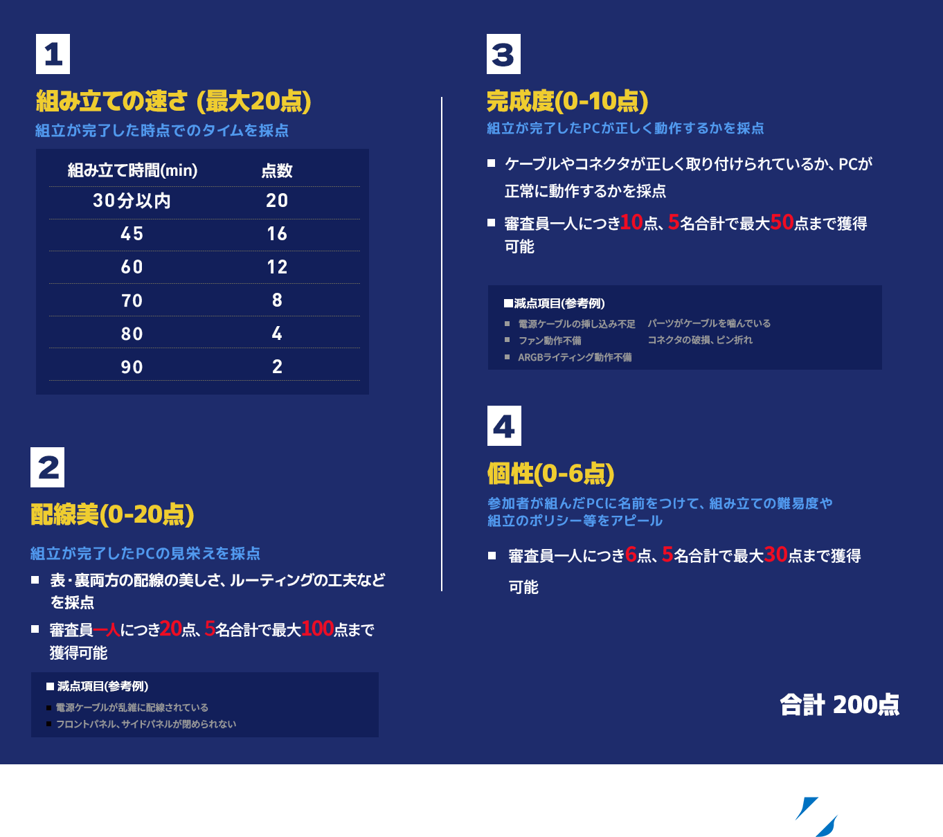 制限時間内にPCを組み立て、4つの審査項目で頂点を目指せ! 「速さ」「配線美」「完成度」「個性」——あなたの“PC魂”が試される。 審査員による厳正な採点のもと、最も優れたカスタムPCを完成させた挑戦者には、 賞品として《100万円相当のハイエンドPCパーツ》を贈呈! さあ、あなたの手で「カスタムPCのチカラ」を世界に示そう。