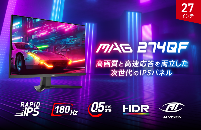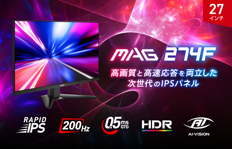 「MAG 274QF」は近年人気が高まっている27インチのWQHD解像度、リフレッシュレート180Hz、応答速度0.5ms(GTG、最小値)、「MAG 274F」は初めてのゲーミングモニターにお勧めな27インチのフルHD解像度、リフレッシュレート200Hz、応答速度0.5ms(GTG、最小値)の高いゲーミング性能を備え、どちらのモデルにも高画質・高速応答に対応したRAPID IPSパネルを搭載し、美しさと高いゲーミング性能を両立しております。