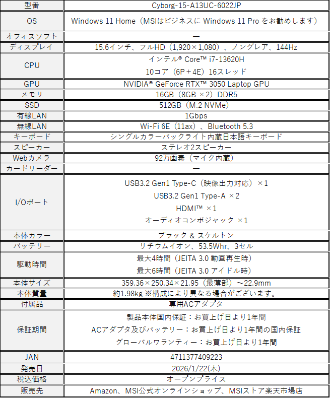 - この度、エムエスアイコンピュータージャパン株式会社は、未来感あふれるサイバーパンクデザインと高性能を融合したゲーミングノートPC「Cyborg 15」シリーズより、「Cyborg-15-A13UC-6022JP」を本日2026年1月22日(木)より順次販売開始いたします。