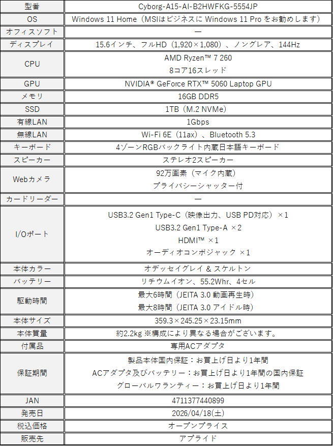 この度、エムエスアイコンピュータージャパン株式会社は、スタイリッシュなスケルトンデザインの本体に「NVIDIA® GeForce RTX™ 50シリーズ Laptop GPU」を搭載したゲーミングノートPC「Cyborg」シリーズよりの15.6インチ・144Hzディスプレイ、Ryzen 7、RTX 5060を搭載したアプライドオリジナルモデル「Cyborg-A15-AI-B2HWFKG-5554JP」を2026年4月18日(土)より順次販売開始いたします。