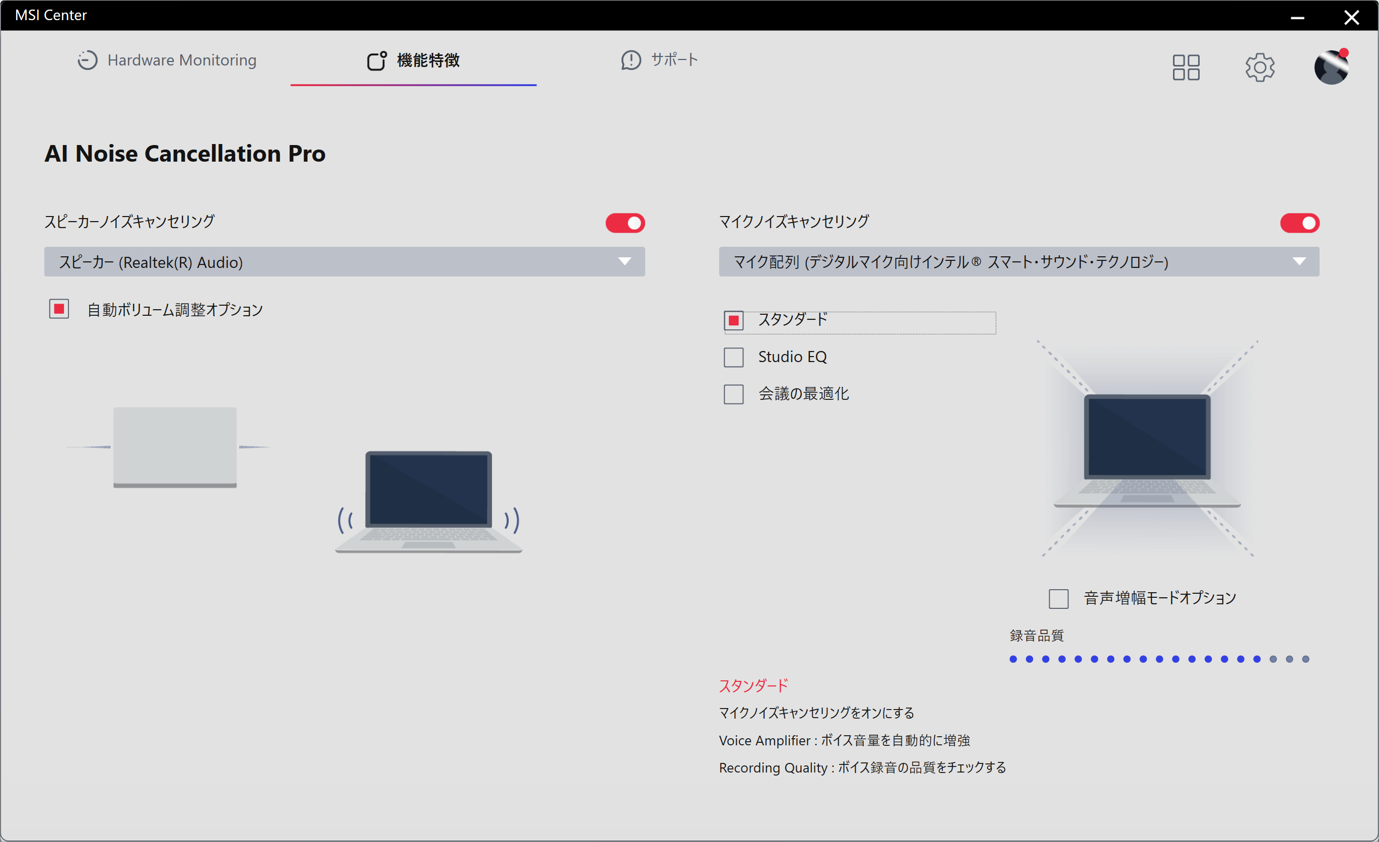 周囲が騒がしいオフィス内やカフェなどでWeb会議に参加する場合、自身の声だけでなく周囲の雑音まで収音されてしまうことがありますが、MSI Centerに実装されている「AI Noise Cancellation Pro」を使用すれば、マイクに収音されてしまった雑音をAI機能を使って除去してクリアな音声にして相手側へ伝えることができます。さらに、ビデオチャットやWeb会議に参加している相手側のマイクに収音されてしまった雑音も除去してくれる機能も搭載しているため、「AI Noise Cancellation Pro」を使用すれば周囲の雑音を気にする必要が無くなります。