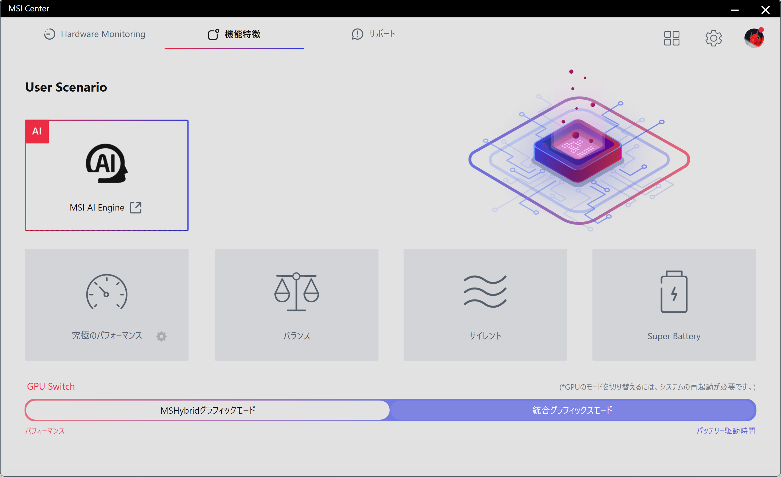 - MSIのノートPCにはシステム管理ソフト「MSI Center」がインストールされています。様々な機能を搭載したMSI Centerの中で最も特徴的な機能といえば、「究極のパフォーマンス」「バランス」「サイレント」「Super Battery」の4段階でノートPCのパフォーマンスを設定できる「User Scenario」です。従来ではユーザーが利用シーンに合わせて最適なパフォーマンスを選択する形になっていましたが、MSI AI Engineの誕生により、ユーザーが都度手動で設定することなく起動するゲームやソフトごとに自動でパフォーマンス設定が変更されるようになりました。