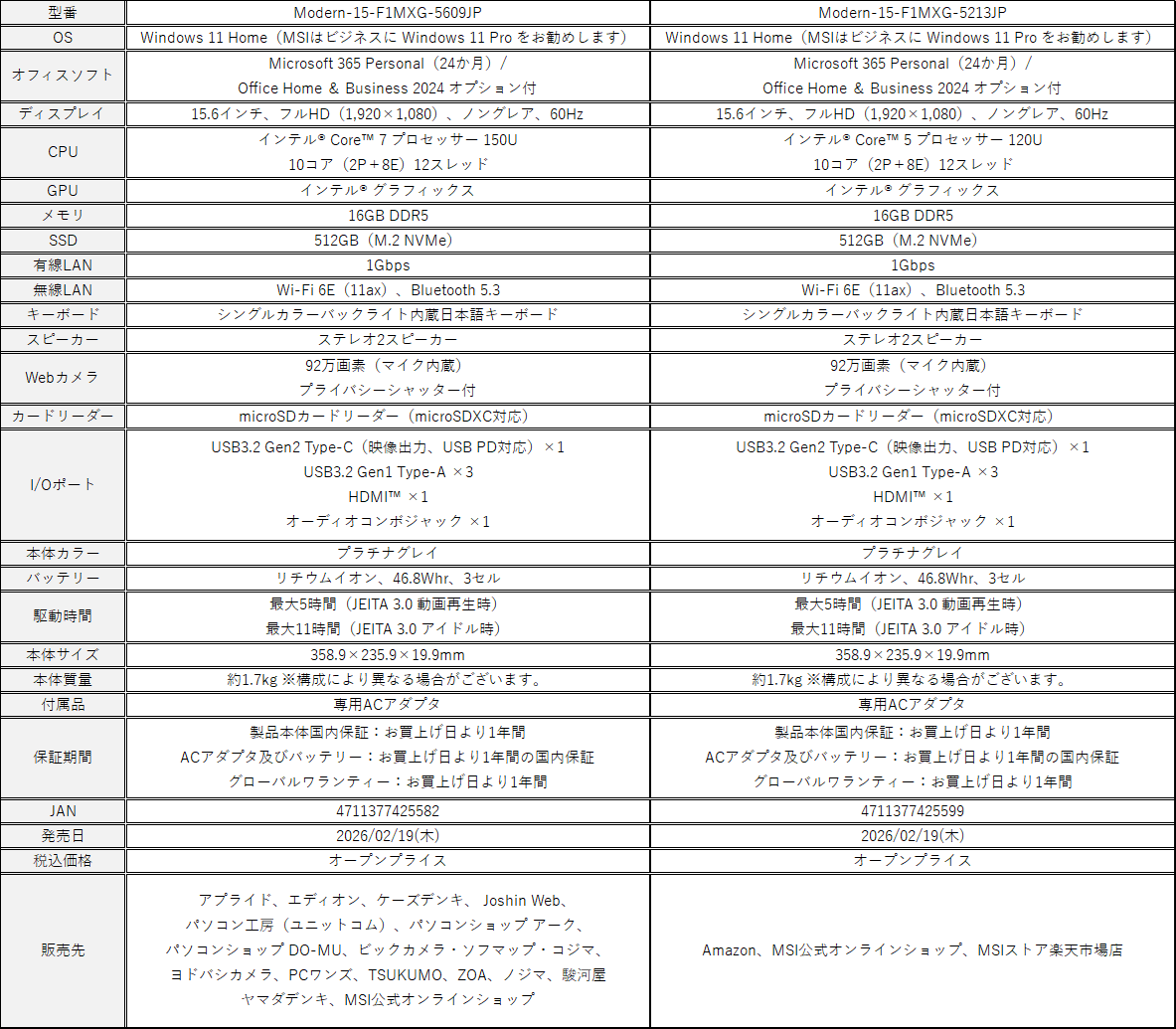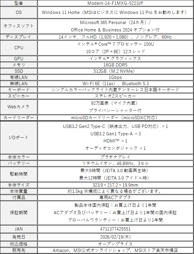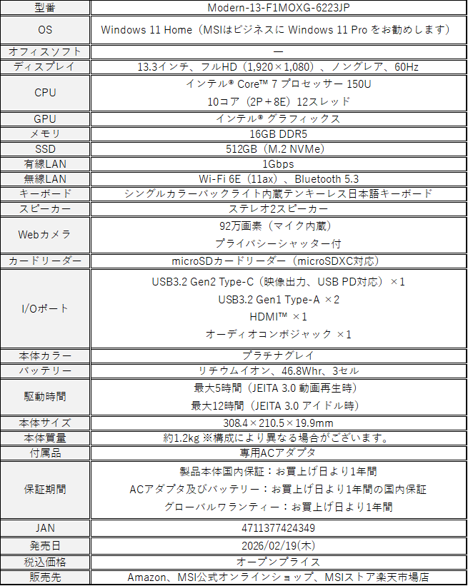 この度、エムエスアイコンピュータージャパン株式会社は、「あたりまえを、より快適に」をコンセプトとしたビジネスノートPC「Modern」シリーズの新製品「Modern-A15-AI-F2HMG-6233JP」 を、2026年2月19日(木)より順次発売いたします。