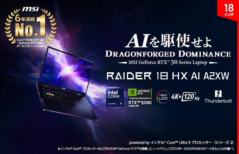 この度、エムエスアイコンピュータージャパン株式会社は、MSIが2025年のトレンドとして注目している「18インチ ゲーミングノートPC」のラインアップをさらに強化するべく、「インテル® Core™ Ultra 9 プロセッサー(シリーズ 2)」と「NVIDIA® GeForce RTX™ 50 シリーズ Laptop GPU」を搭載した「Raider 18 HX AI A2XW」と「Vector 18 HX AI A2XW」シリーズの日本国内向けモデルを2025年6月12日(木)より順次販売開始いたします。
