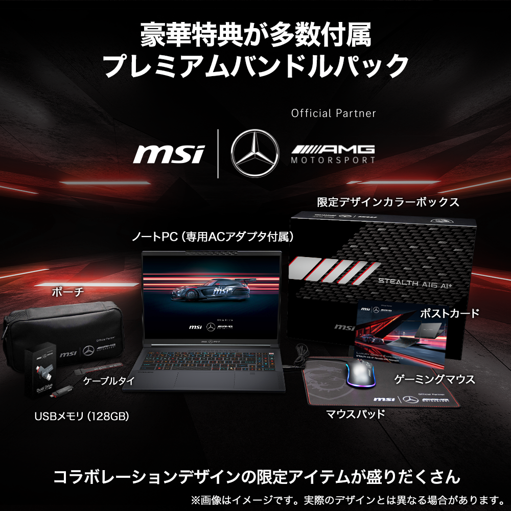 - Mercedes-AMG Motorsportコラボレーションモデル第3弾の発売に合わせて、「Stealth A16 AI+ Mercedes-AMG Motorsport A3XW」もしくは「Prestige 16 AI+ Mercedes-AMG Motorsport B2VM」をお買い上げいただいた方限定で「Mercedes-AMG GT3 MSI Limited Edition」1/18スケール Carモデルをプレゼントいたします。MSIメンバーセンターにログインしていただき、お買い上げいただいた「Stealth A16 AI+ Mercedes-AMG Motorsport A3XW」もしくは「Prestige 16 AI+ Mercedes-AMG Motorsport B2VM」の製品登録に加え、「その他キャンペーンやイベントの登録・詳細について」に表示されている該当キャンペーンに必要事項をご入力してご応募していただくと先着100名様にプレゼントいたします。