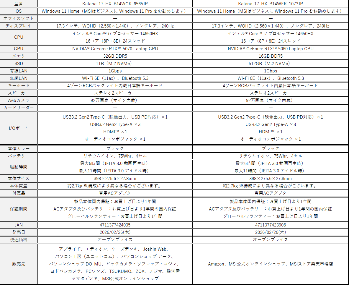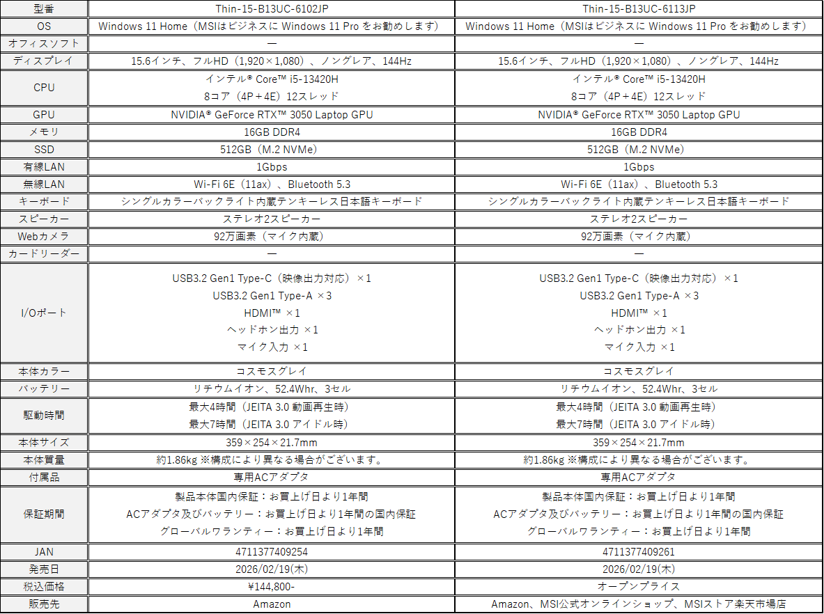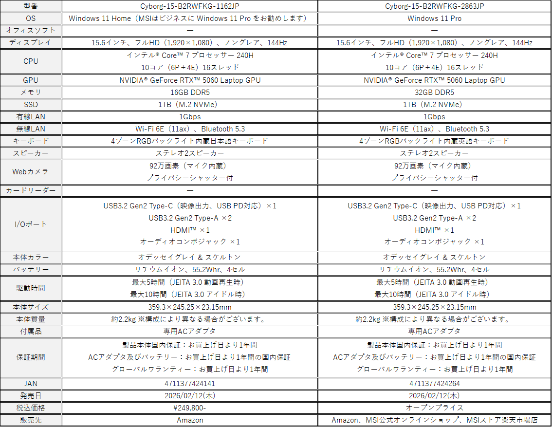 - この度、エムエスアイコンピュータージャパン株式会社は、「GeForce RTX™ 50 シリーズ Laptop GPU」を搭載したゲーミングノートPCを中心に、「2026年春モデル」一挙19モデルを2026年2月12日(木)より順次販売開始 いたします。