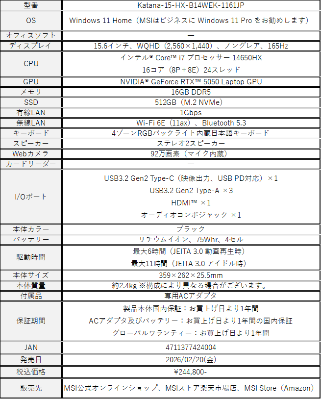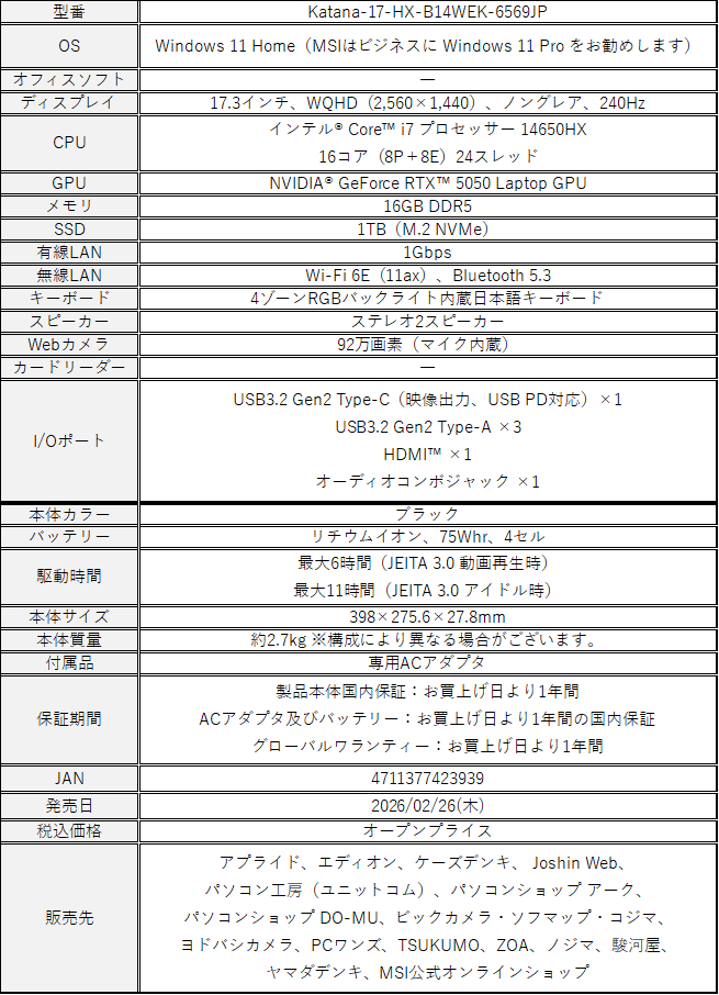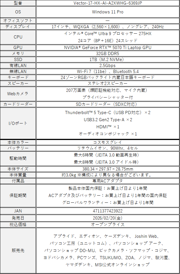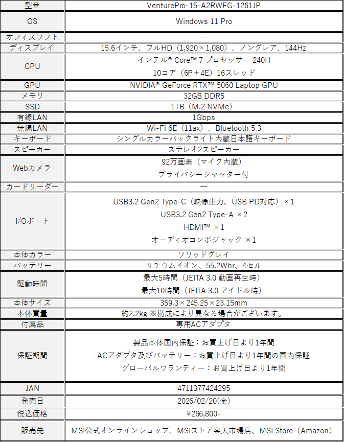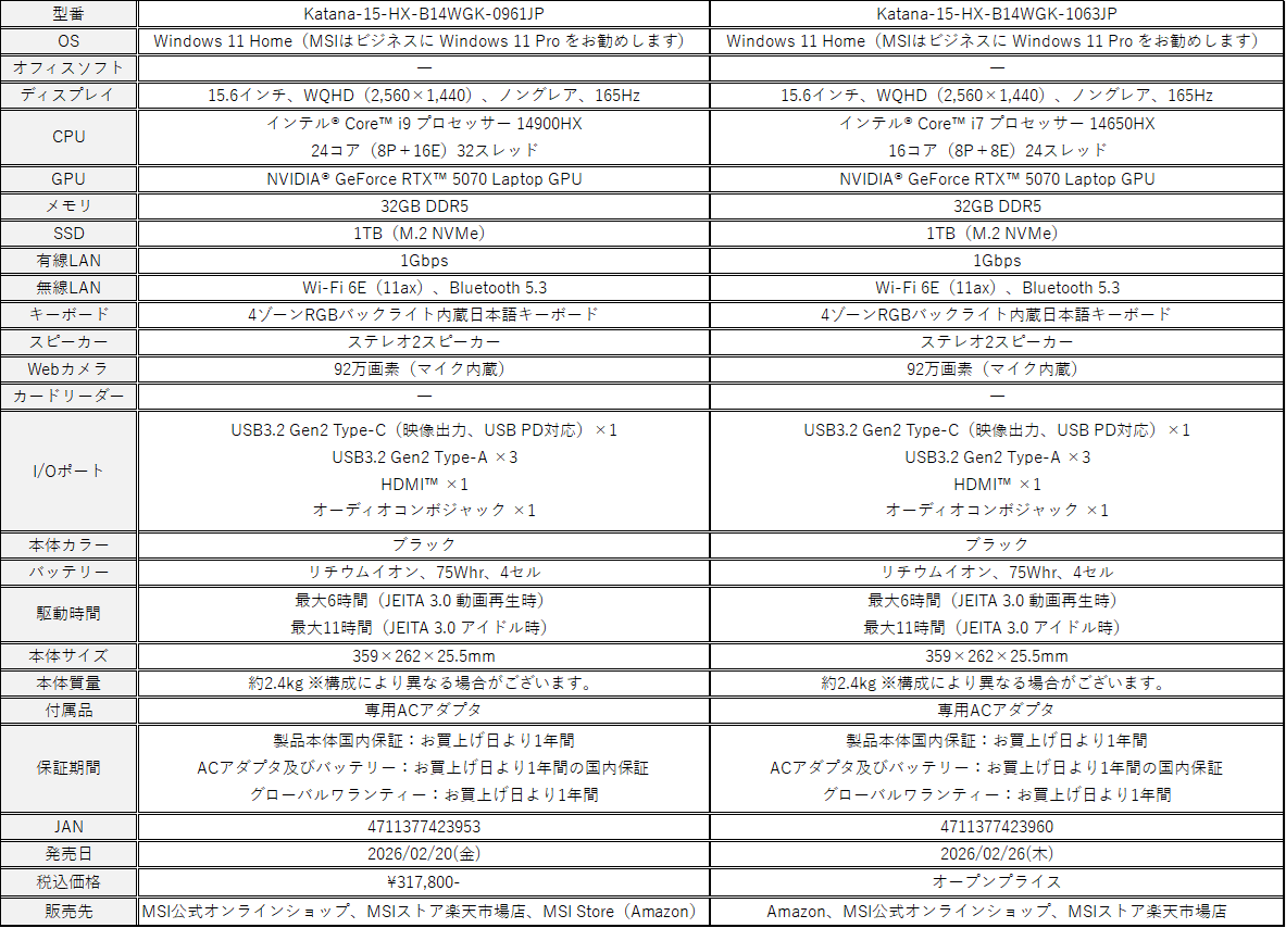 - この度、エムエスアイコンピュータージャパン株式会社は、「GeForce RTX™ 50 シリーズ Laptop GPU」を搭載したゲーミングノートPCを中心に、「2026年春モデル」一挙19モデルを2026年2月12日(木)より順次販売開始 いたします。
