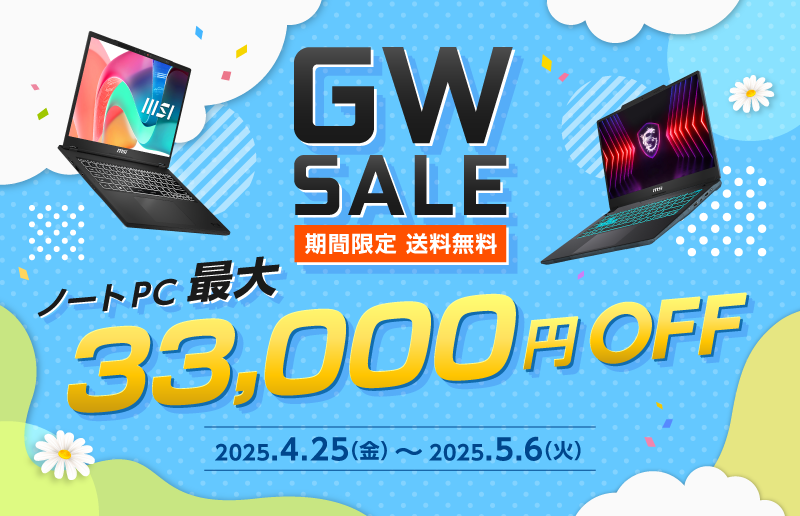 - この度、エムエスアイコンピュータージャパン株式会社は2025年4月25日(金)から5月6日(火)まで、キヤノンマーケティングジャパン株式会社が運営するMSI公式オンラインショップ(以下、MSIストア)にて、ゲーミングノートPCやビジネスノートPCが最大33,000円OFFになる『MSIストア GW SALE』(以下、本キャンペーン)を開催いたします。また、本キャンペーン期間中、MSIストアでご注文いただいた商品を全て送料無料でお届けいたします。