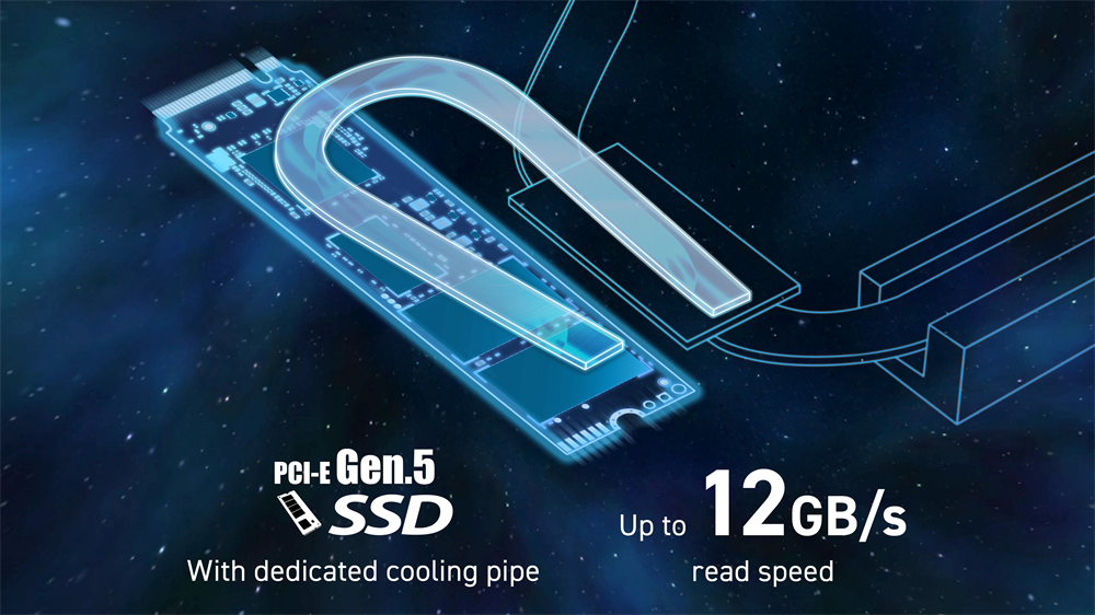 - MSIは、M.2 NVMe PCI-e Gen5 SSDに対してヒートパイプを備えた新しいSSD冷却システムを開発しました。このSSD冷却システムは、PCIe Gen 5 SSDの最大温度を最大10°C低減します。これにより、重い作業負荷の下でも安定したパフォーマンス、信頼性の高いデータ転送が可能になります。さらにストレージパフォーマンスを向上させるために、MSIはGen5とGen4 SSDを組み合わせたSuper RAID 5を導入し、最大18,000MB/sの印象的な読み取り速度を実現します。これにより、最も要求の厳しいアプリケーションでもシームレスなデータアクセスと超高速のロード時間が可能になります。