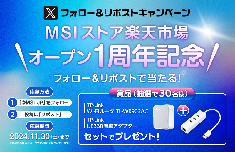 - ~XでMSIアカウントフォロー & 対象ポストをリポストすると抽選で30名様に豪華アイテムをプレゼント~