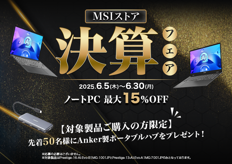 - この度、エムエスアイコンピュータージャパン株式会社は2025年6月5日(木)から6月30日(月)まで、キヤノンマーケティングジャパン株式会社が運営するMSI公式オンラインショップ(以下、MSIストア)にて、ゲーミングノートPCや高性能ビジネスノートPCが最大15%OFFになる『MSIストア 決算フェア』(以下、本キャンペーン)を開催いたします。