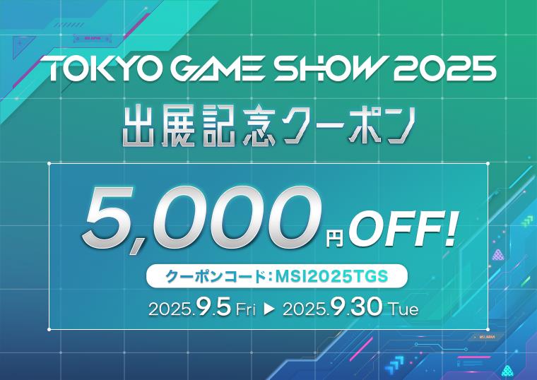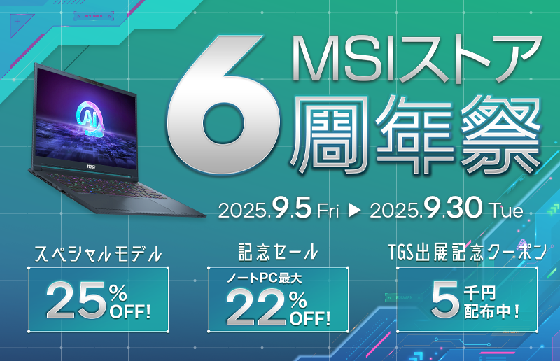 - 『MSIストア 6周年祭』では、コンピューターエンタテイメントの総合展示会「東京ゲームショウ 2025」の開催を記念して、期間中、MSIストアにて対象ノートPCのご購入時にご利用いただけるお得なクーポンをキャンペーン特設ページにて配布いたします。クーポンをご利用いただくことで、対象ノートPCが表示価格より税込5,000円オフにてご購入いただけます。※1、※3、※4、※5