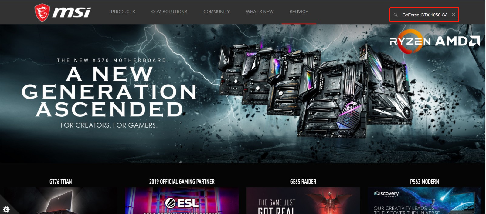 - ●MSI公式Webサイトの右上の検索バーにモデル名を入力します。