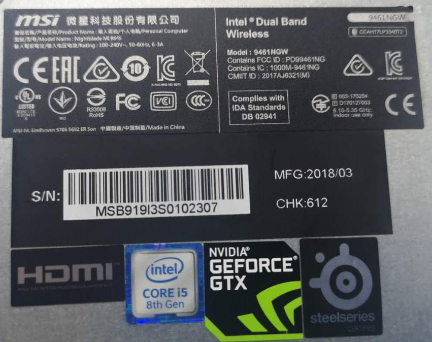 - 1. ケースの底のラベルにモデル名が記載されています(たとえば、Nightblade MI B919など)。