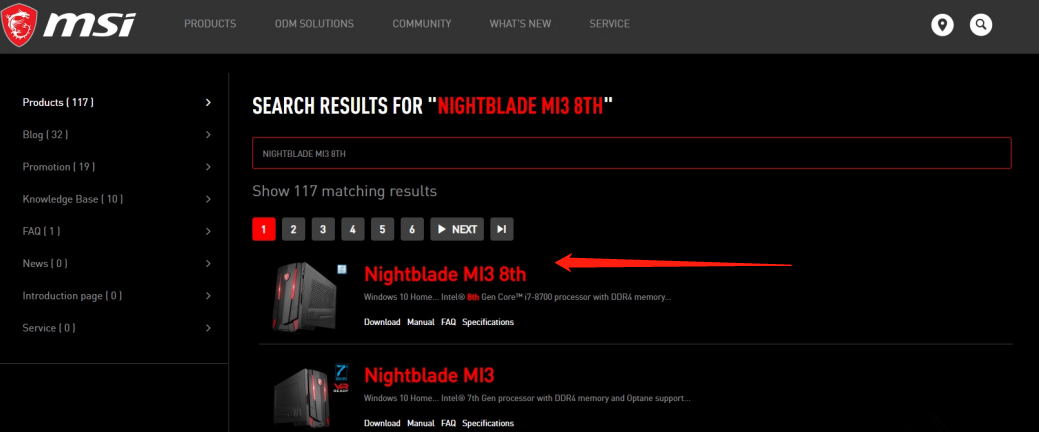 - 2. MSI公式Webサイトで検索(虫眼鏡)アイコン をクリック → 「Nightblade MI3 8th」と入力 → [Enter]キーを押して検索します。