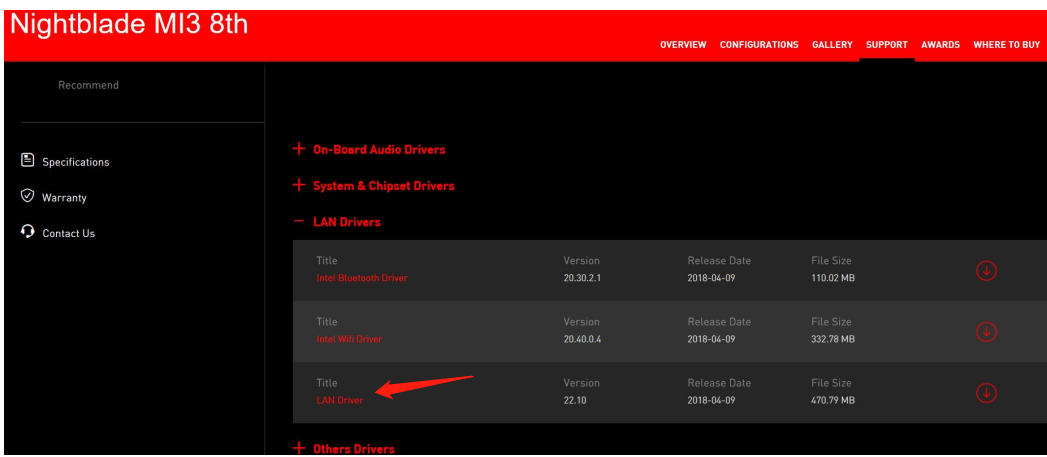 - 5. [LAN drivers]および[Intel Wifi Driver]を選択します。[Download(ダウンロード)]をクリックします。