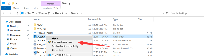 - 8. ドライバーパッケージが解凍されたら、フォルダ内の[Autorun.exe]アプリケーションを右クリックし、[Execute as Administrator(管理者として実行)]を選択します。