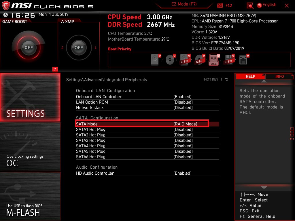 o [Settings(設定)]を選択 → [Advanced(詳細設定)]をクリック → [SATA mode(SATAモード)]を[RAID mode]に設定します。