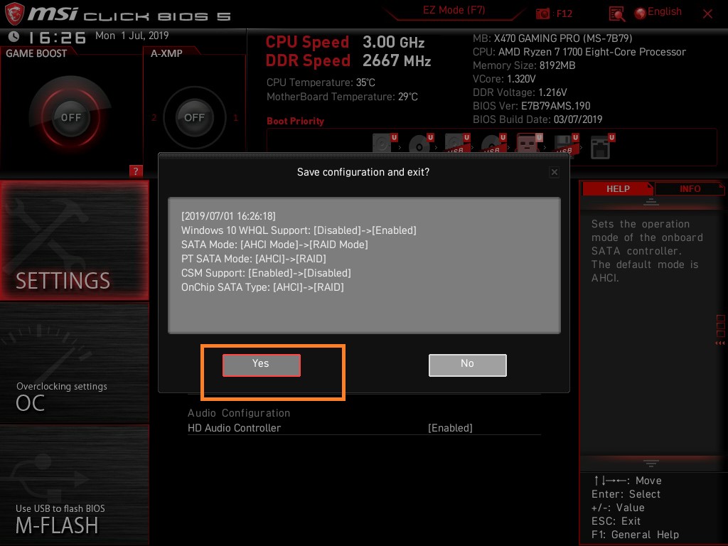 o [F10] を押す → [Yes(はい)]をクリックして保存および終了します。すると、PCが再起動します。