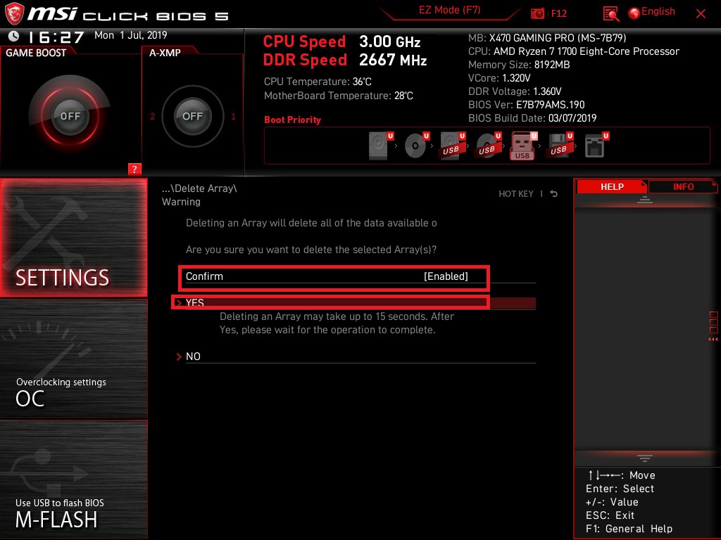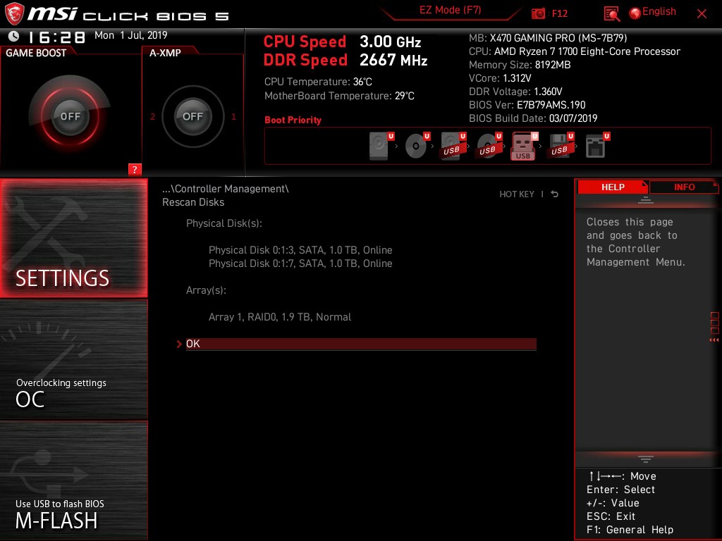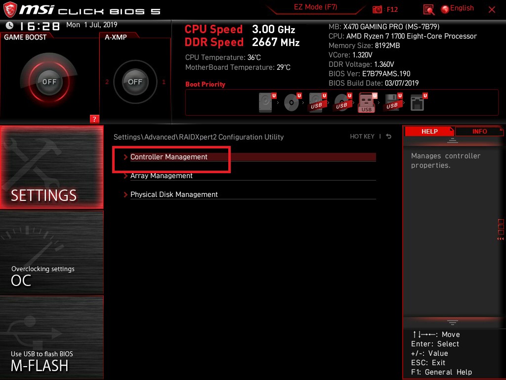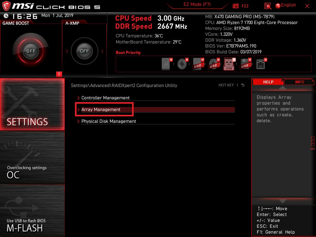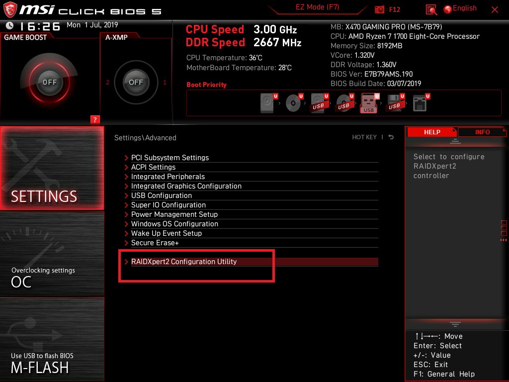 o [SETTINGS(設定)]を選択 → [Advanced(詳細設定)] → [RAIDXpert2 Configuration Utility(RAIDXpert2構成)]を選択します。