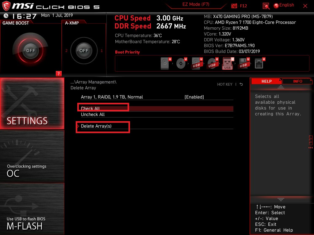 o [check All(すべてを確認)]を選択 → [Delete Array(s)(アレイの削除)]をクリックします。