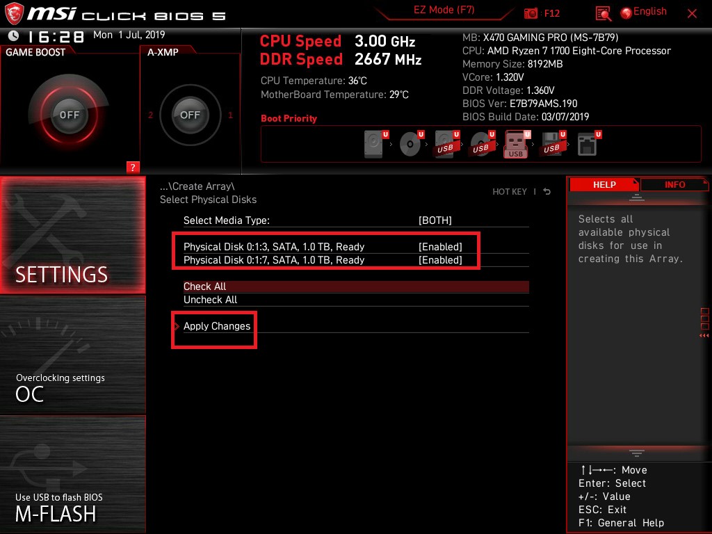 o RAIDディスクを選択します。たとえば、[Physical Disk 0:1:3]および[Physical Disk0:1:7]を[Enable]に設定 [Apply Changes(変更を適用)]をクリックします。