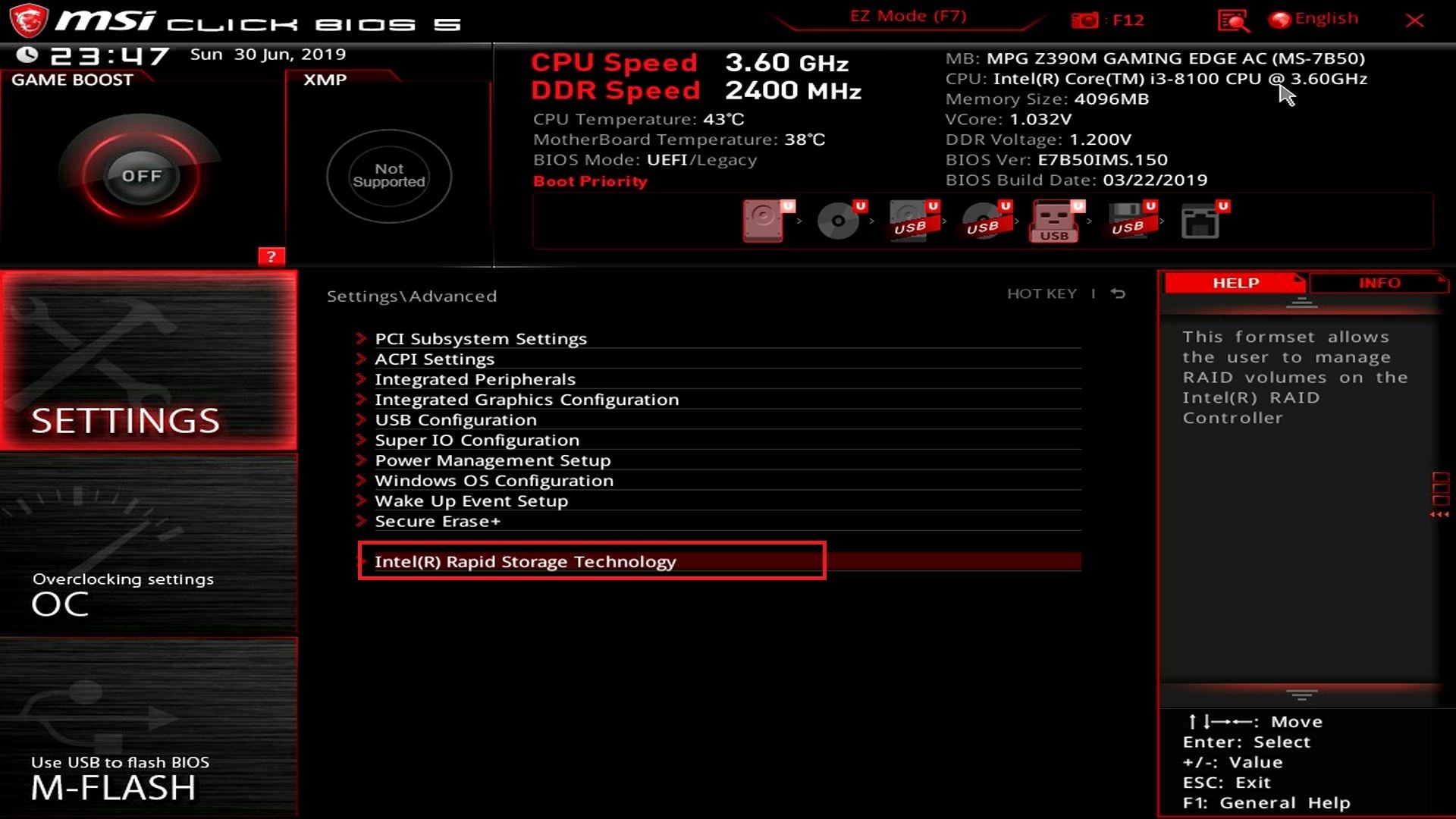 o [SETTINGS(設定)]を選択 → [Advanced(詳細設定)]を選択 → [Intel(R) Rapid Storage Technology]を選択します。