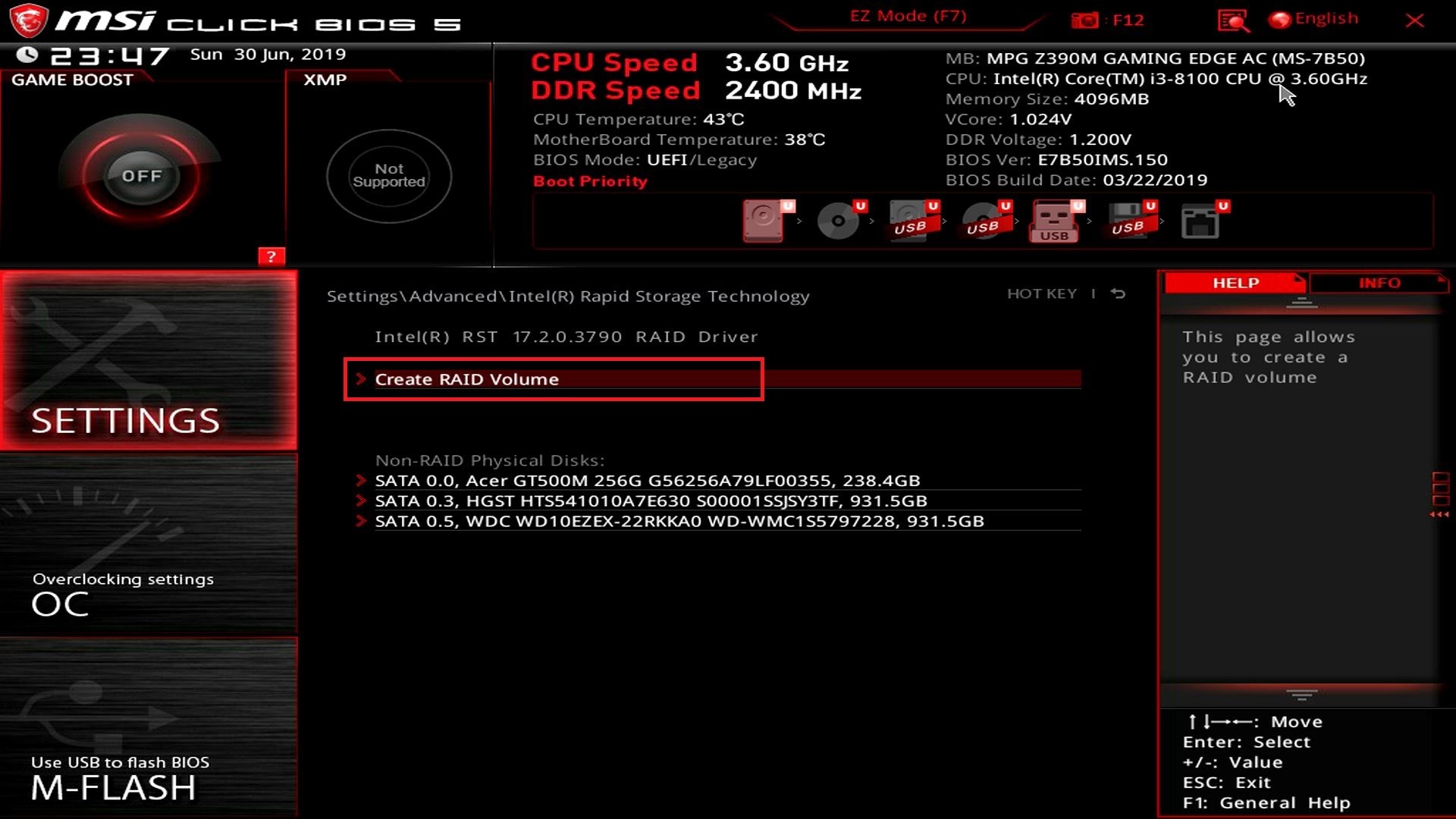 o [SETTINGS(設定)]を選択 [advanced(詳細設定)]を選択 [SATA mode(SATAモード)]を[RAID/Optane Mode]に設定します。