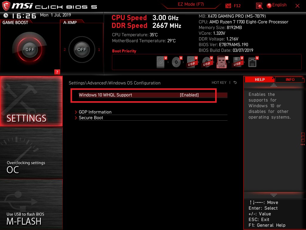 o [SETTINGS(設定)]を選択 → [Advanced(詳細設定)] → [Windows OS Configurations(Windows OS構成)] → [Windows 10 WHQL Support(Windows 10 WHQLサポート)]を[Enable(有効)]に設定します。