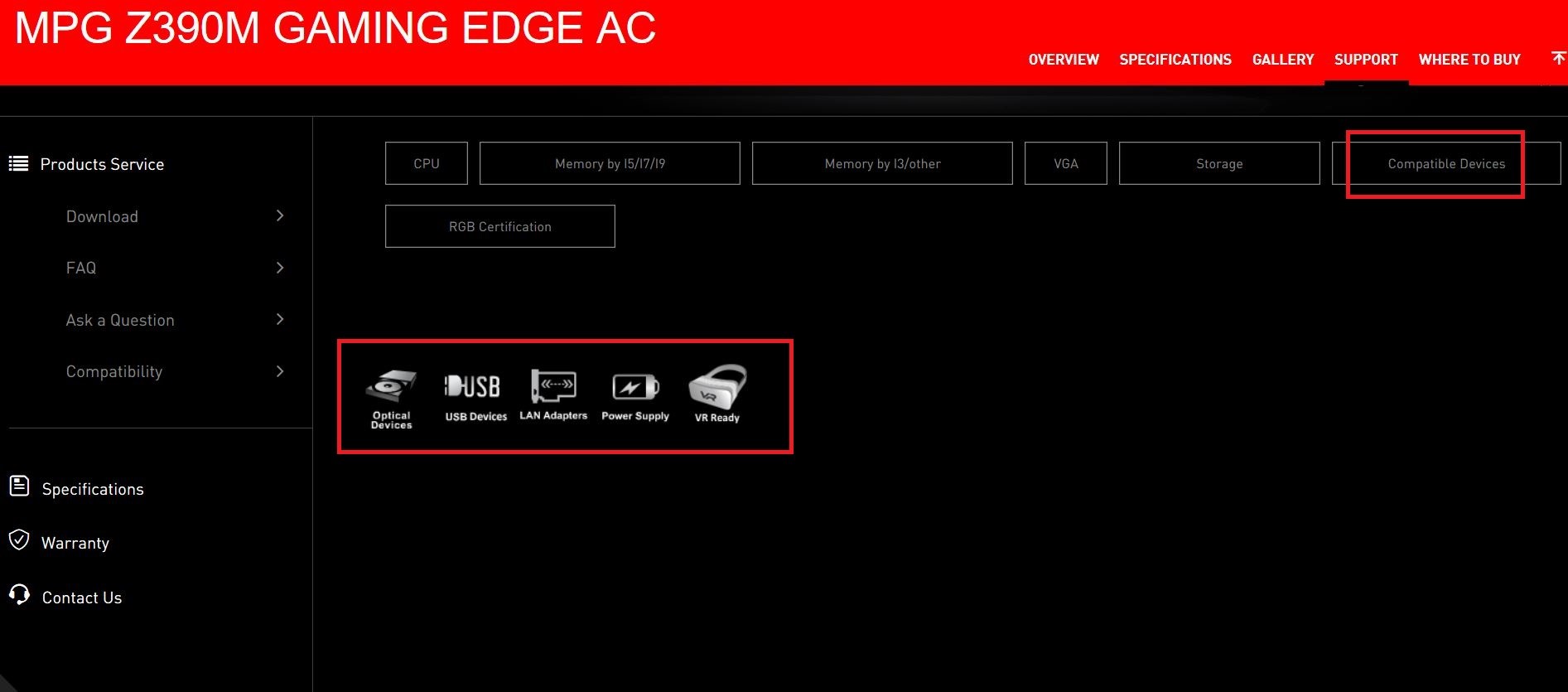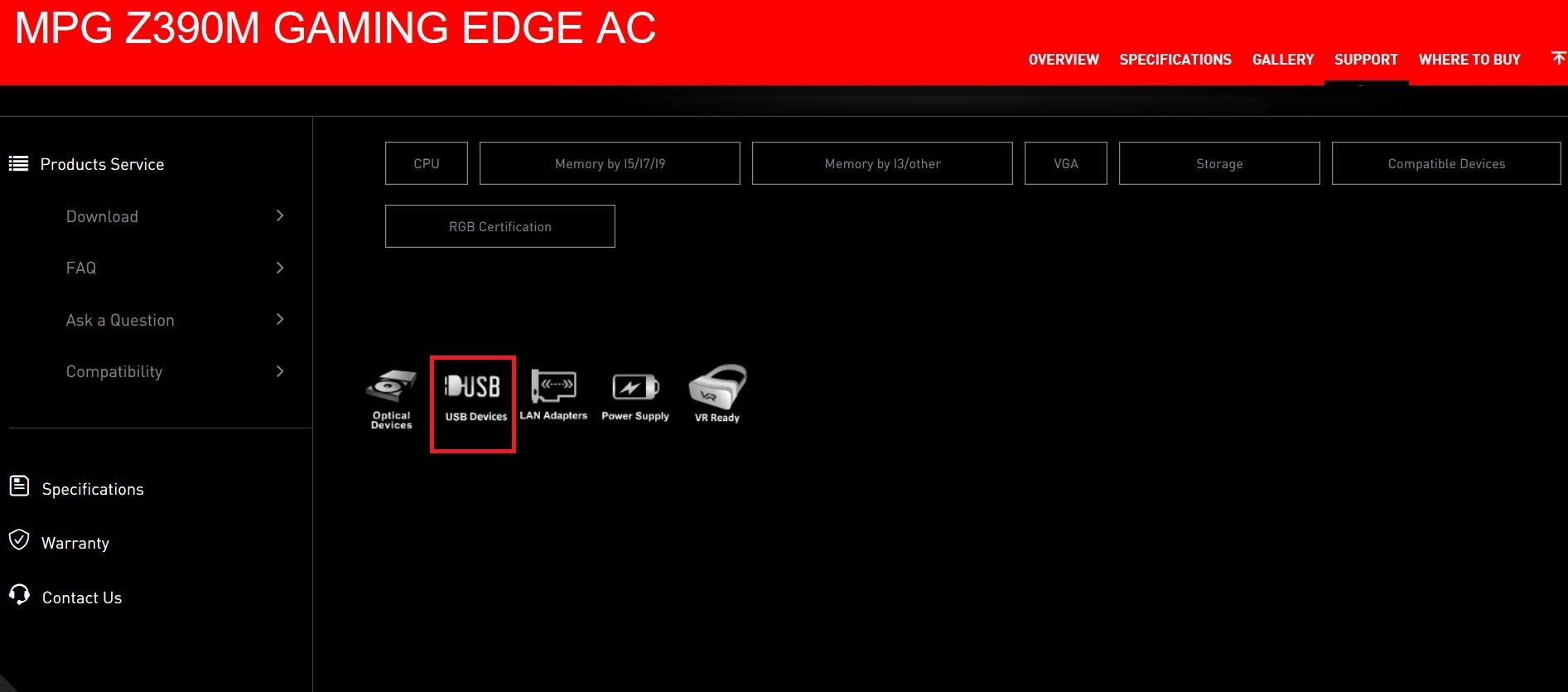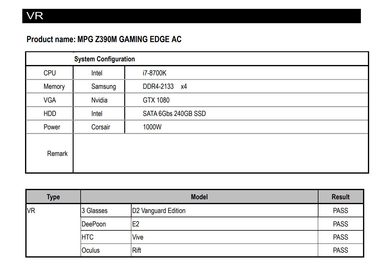 MSI公式Webサイトで互換性レポートを参照してください。選択に応じてストレージ、グラフィックスカード、VRデバイス、電源装置、LAアダプター、USBデバイス、光学ドライブの情報を調べることができます。