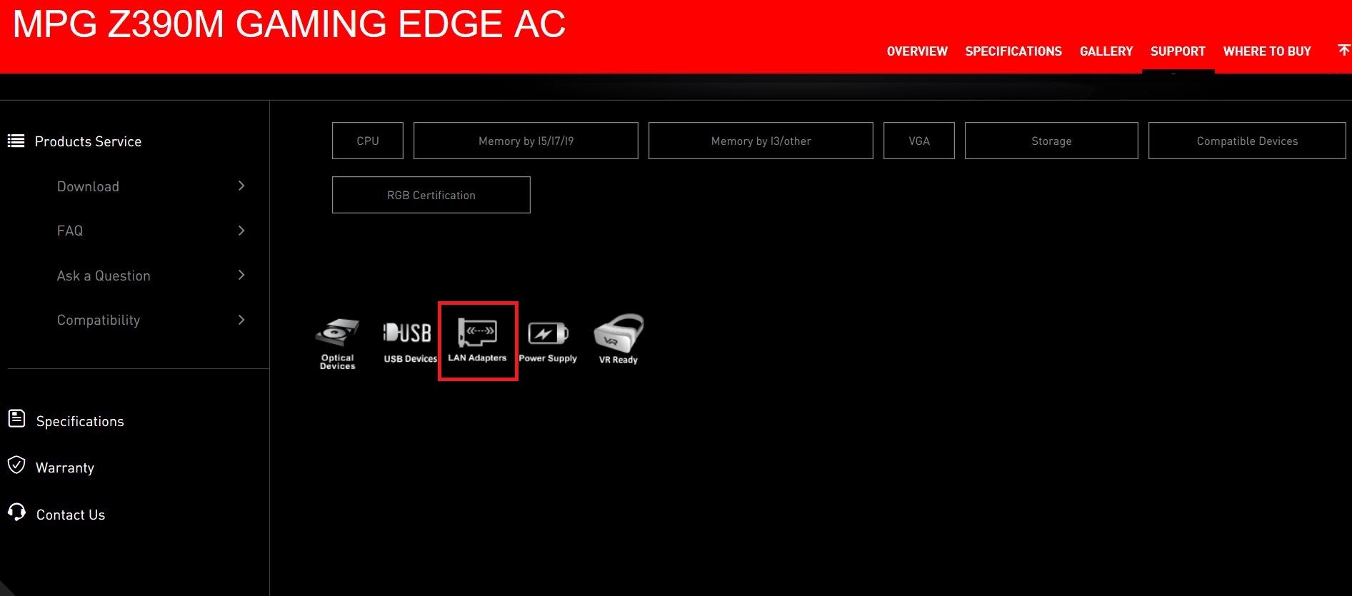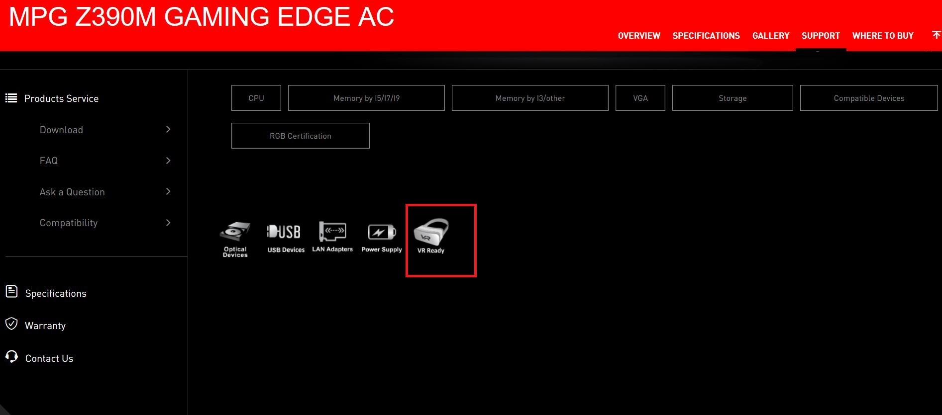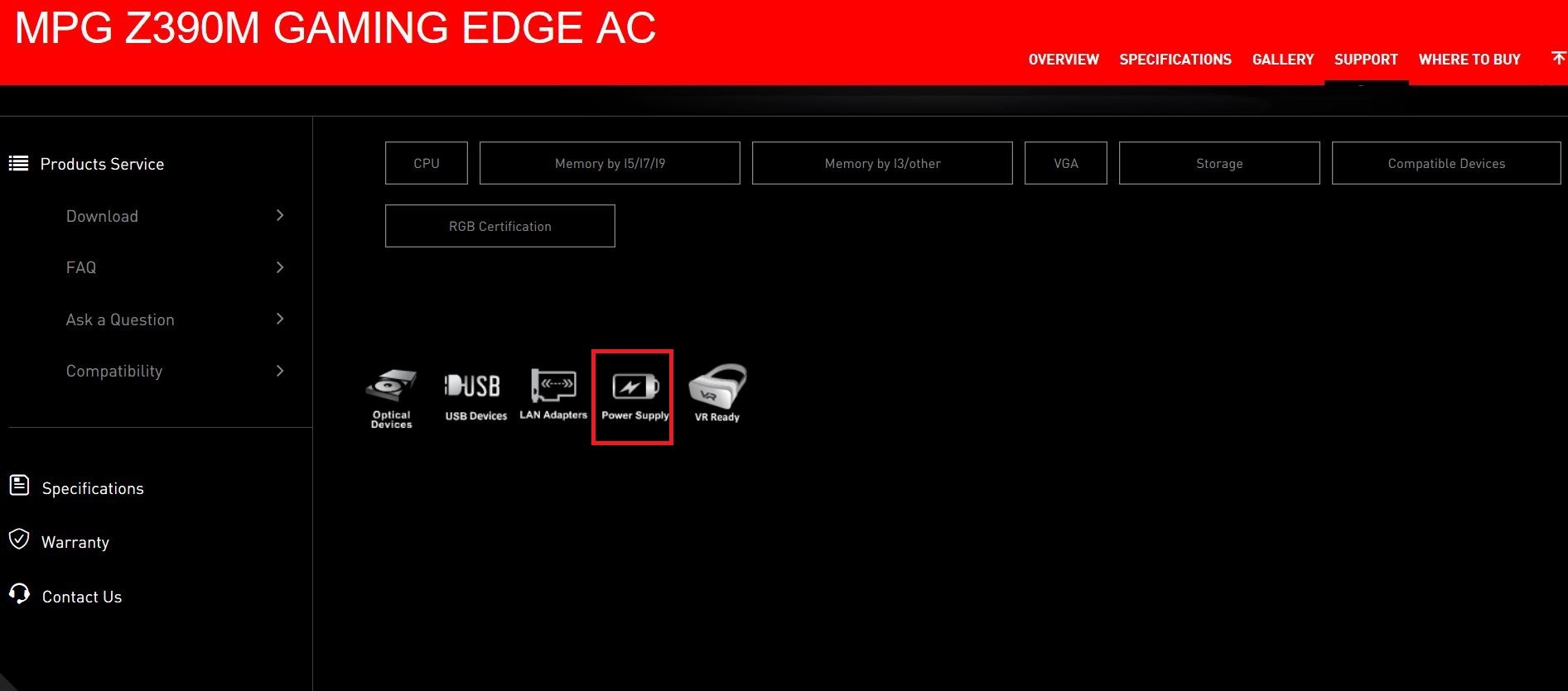 MSI公式Webサイトで互換性レポートを参照してください。選択に応じてストレージ、グラフィックスカード、VRデバイス、電源装置、LAアダプター、USBデバイス、光学ドライブの情報を調べることができます。