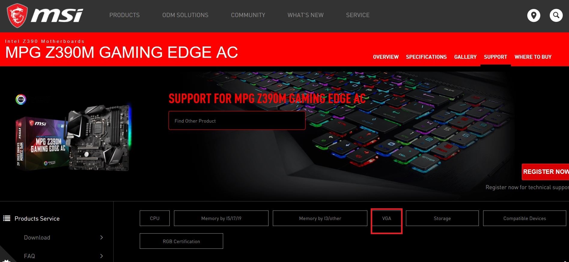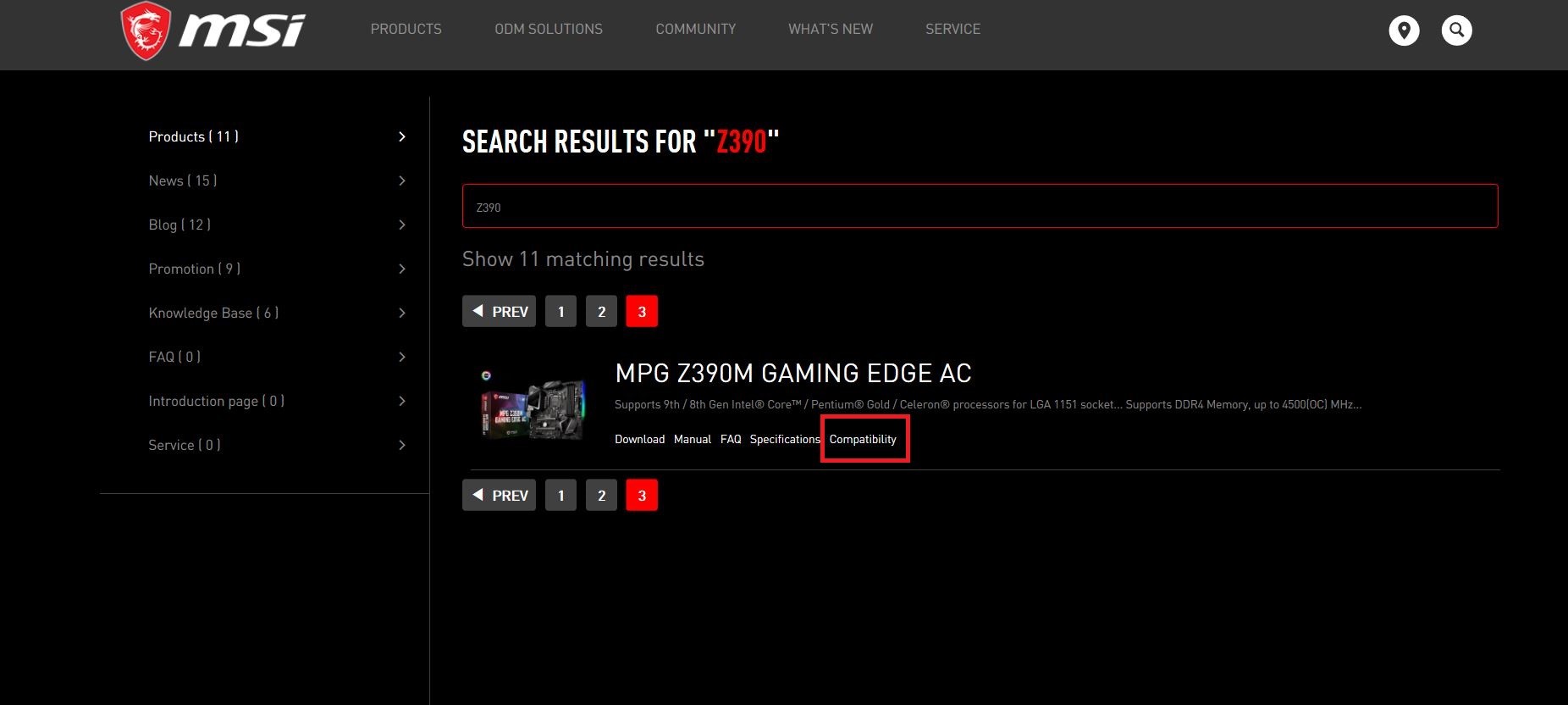 o MSI公式Webサイトで右上の検索バーにモデル名を入力します。