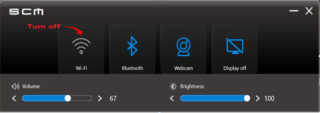 - ●また、デバイスのWi-Fiの電源は、「SCM」アプリケーションを使ってオンにすることができます。(SCMでワイヤレスインジケーターが灰色で表示される場合は、デバイスの電源が入っていないことを意味します。このアイコンをクリックしてデバイスの電源を入れてください。)