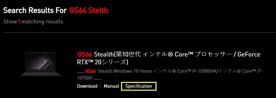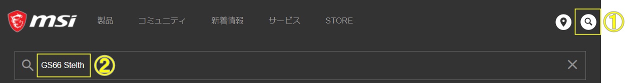 2. MSI公式Webサイトにアクセスして、サイト右上の虫眼鏡マークをクリックし「GS66 Stelth」と入力後、Enterキーを押して検索します。