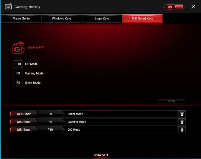 ![]() [MSI Smart Keys] (MSIスマートキー) | MSIスマートキーのホットキーを設定できます。 |